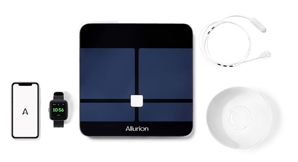 The Allurion Program includes a digital scale and a Health Tracker watch that sync with the Allurion App, allowing for detailed tracking of your weight, activities, and overall progress.